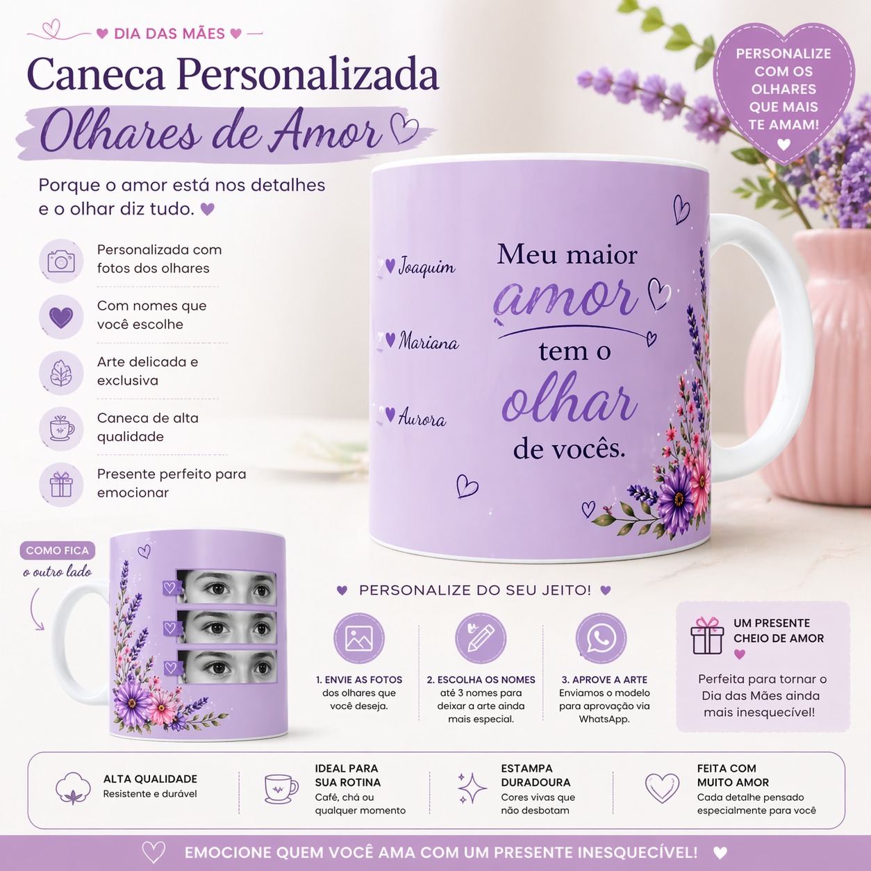 A Caneca Olhares de Amor foi criada para eternizar um dos sentimentos mais especiais: o olhar de quem você mais ama. Uma peça delicada, personalizada e cheia de significado, perfeita para emocionar de verdade ✨